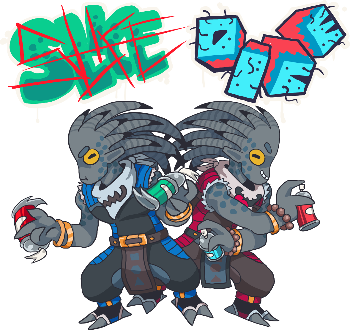 Starfarers can see the tags Slice and Dice go up all around Titan Garden, these are Zumiel and Zunara's handles, respectively. Slice's writing style is distinct in that he like to compress and stack his letters in non-linear ways, letting them overlap and mush into one bigger shape, and then apply a second layer on top of that for emphasis. He calls his process the "Tungsten Two-Step" but no one has ever been able to get him to explain why. The bottom layer of Slice's tags usually have some kind of texture or embellishment to help signify the structure of his letters within the big pile-up of his designs, and the top layer is always some kind of sharp contrasting color meant to stand out from the base and emphasize the theme of the piece. Best anyone can figure is because there's two parts to his tags, that's why it's a "two-step," but no one knows where the Tungsten comes from. Dice's style is distinct from Slice, she prefers to work in big round comic-book shapes with big bold outlines. Where Slice's compositions tend to build on layers of flat shapes, Dice loves to incorporate three-dimensionality into her designs. She likes to tease Paulie that he's going to school to learn to copy the shapes she figured out on her own; Paulie gets his feathers ruffled over this and it's always real funny when it happens, because everyone knows who is always pulling who out of the fights he's always starting when he gets wound up like this. Both Slice and Dice prefer fleshy and aggressive themes to their tags and they love to put them up overtop of other writer's tags in turf that other crews want to claim as their own. If someone starts a fight with the Ring City Wreckers they're likely to find all their tags covered up by gross-looking Slice and Dice pieces, and if they want to try to catch them in the act and do something about it they gotta know they're fixing to jump a pair of Callistans with no known home address and a celestial love for getting their quills stuck into a good scrap. It's much less of a headache to be on good terms with the Wreckers than the alternative.